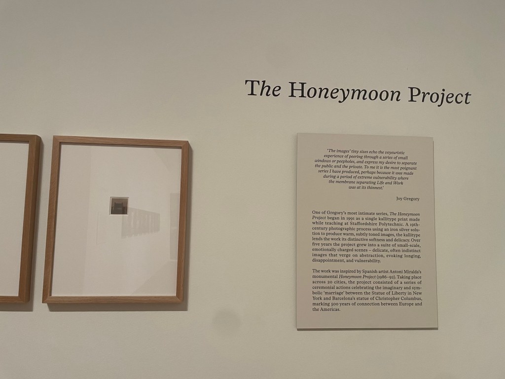 My favourite of all the work I saw by Joy Gregory was The Honeymoon Project, I really enjoyed the intimate closeness that viewing the small photographs required. It felt almost too close at points, as though I was breaking an invisible barrier between myself – the audience/ viewer, and the sacred work. Perhaps it felt more sacred due to the otherwise silent, empty gallery at that point in time, or simply because I really enjoyed the mass of the exhibition as a whole and so it felt poignant just to be there.