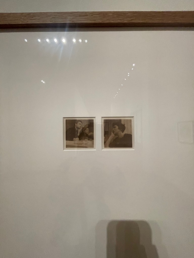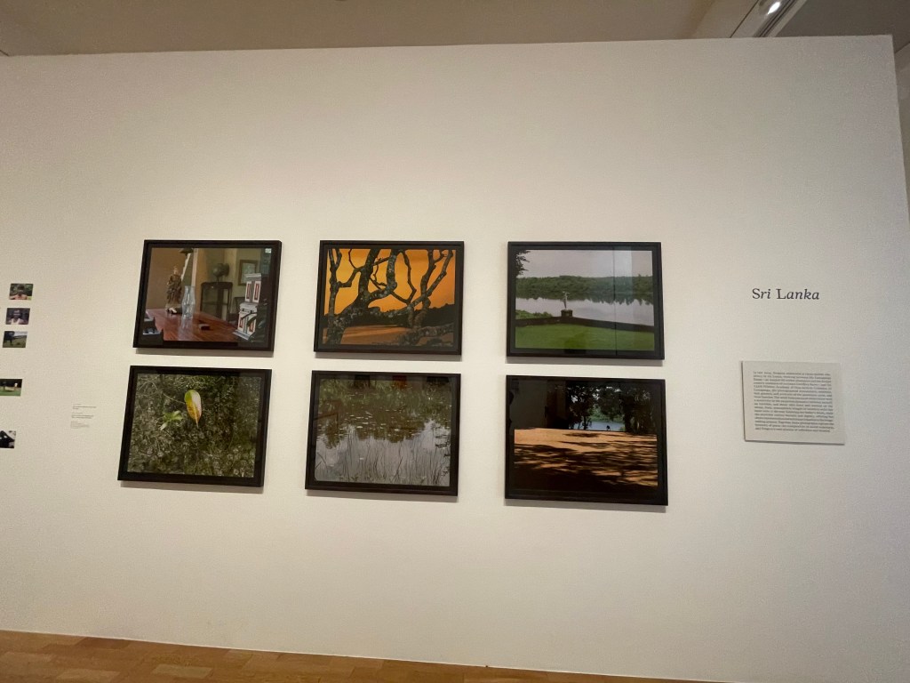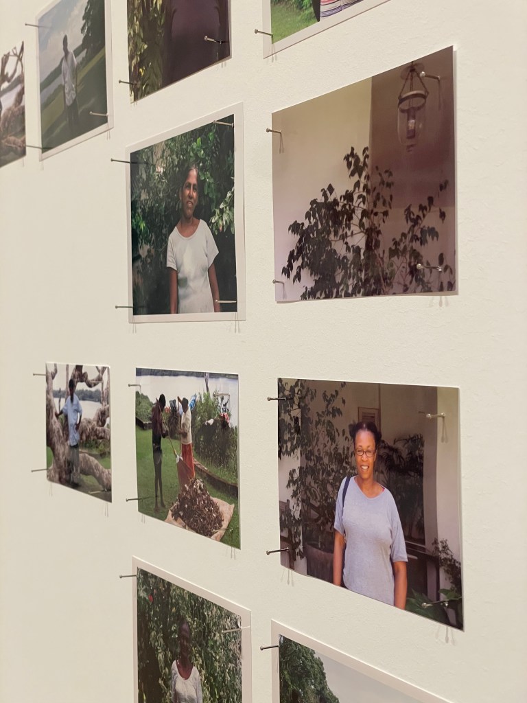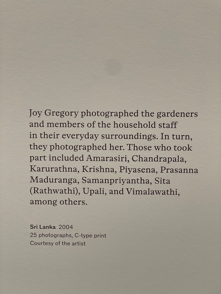 Another consideration I made whilst walking around, and taking photos in this exhibition, were the reflections in/ on glass. In many of th thought-provoking works, as I leant in for a more detailed view, I was greeted by my own reflection. This naturally made me consider how I view myself before the presented works, and the subjects of them – am I just here to view, am I intended to be as much a part of the created exhibition experience as the people and stories inside each frame, and as involved in the process as the artist themself. I felt evoked by the photographs themselves to engage in community, particularly through Gregory’s colour photography works which themselves seemed to be more accepting of life; documenting events and people as they happen, rather than work which was presented in (mostly) duotone prints – which felt more solo and constructed to represent a thought, or series of thoughts. For example, the series Girl Thing, The Handbag Project, and Objects of Beauty, which were all produced through processes using only white and one other colour, such as Cyanotype, Salt Print, and Kallitype (respectively) – were more representative, and expressed/ questioned opinions on how society views femininity. Whereas, the colour-photo series Sri Lanka felt more observational, allowing images and their subjects to speak in a more directly personal context of themselves and the artist.