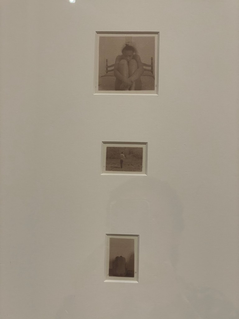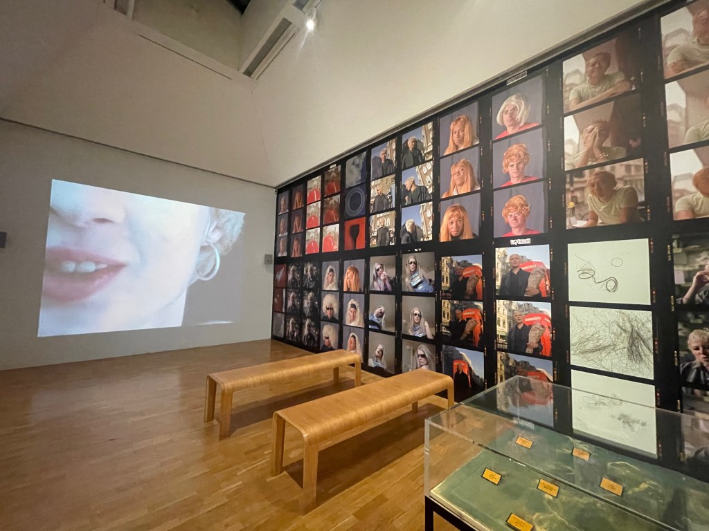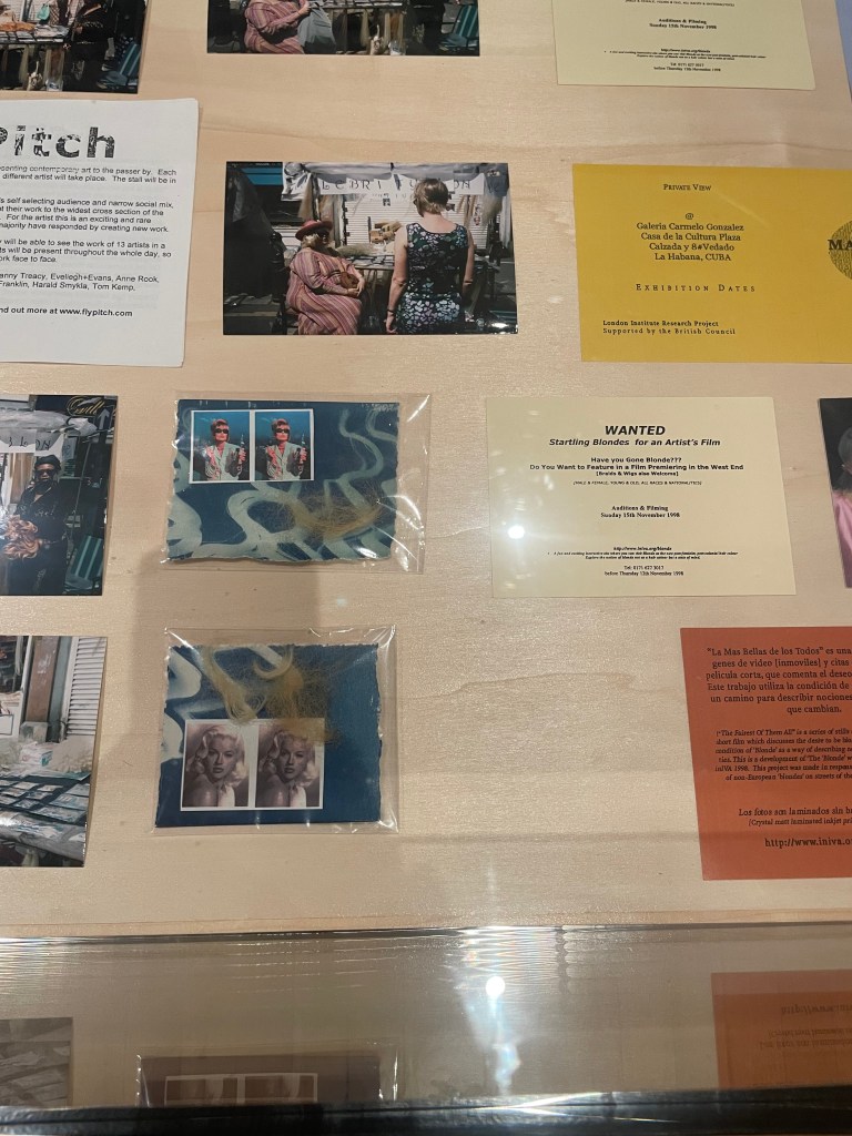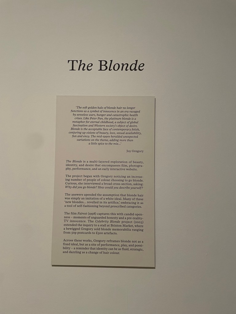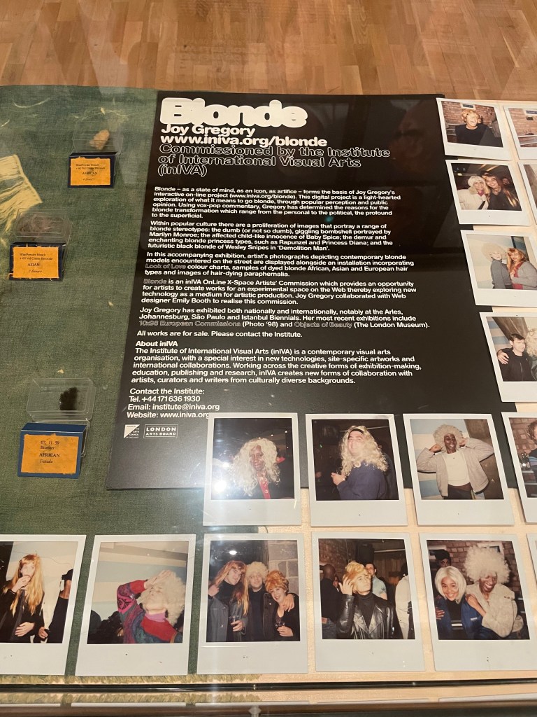 Upstairs in the exhibition, I enjoyed Joy Gregory’s work The Blonde, which featured large photographs covering the walls, and a projected film called Fairest (1998), as well as display cases of hair. I enjoyed the multidiscipline aspects of this room, and the style of images used as to me they felt very nostalgic. The hair within the display case, made the experience feel a little more physical, despite not being able to touch anything, of course.