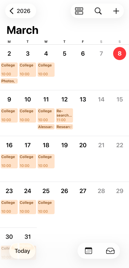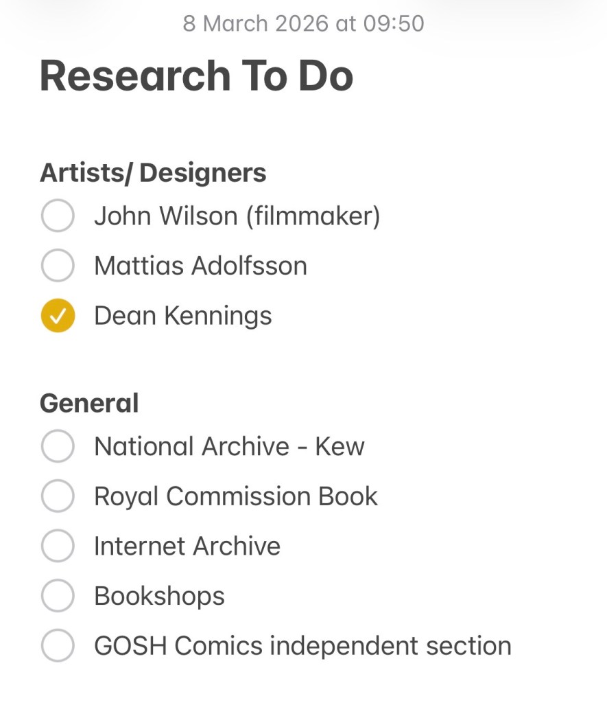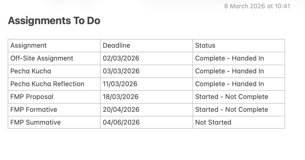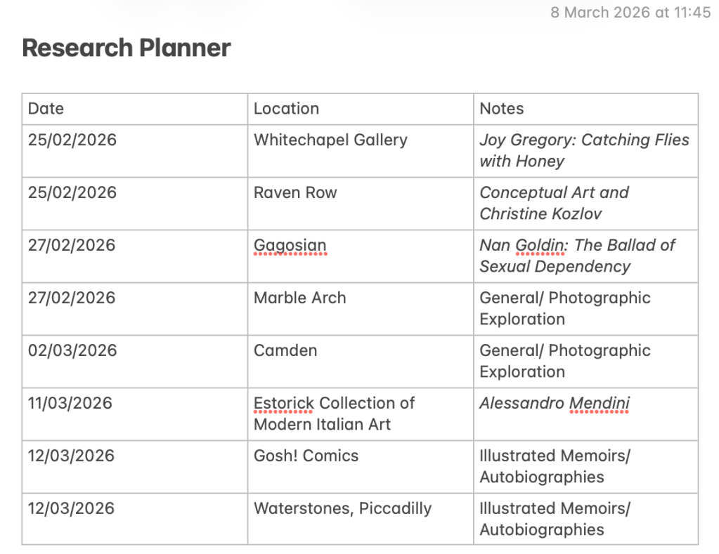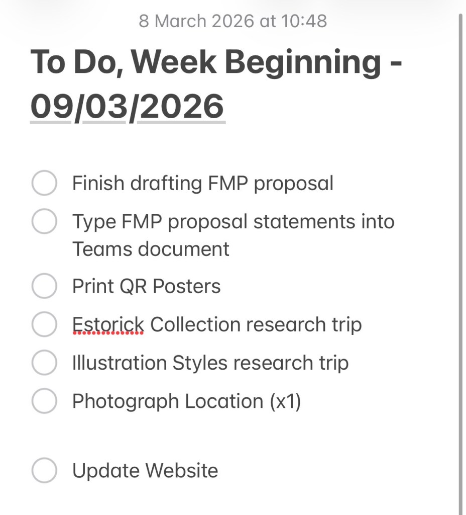 I also keep a calendar on my iPhone, specifically for FMP related scheduling – this is a really helpful way of visually breaking down my tasks, and research trips, as well as being a useful way to document when I did things – before I add them to my Research Bibliography.