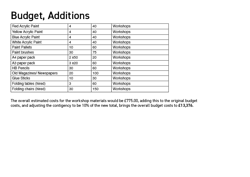 I have outlined the additional material costs for workshops, and adjusted the budget accordingly.