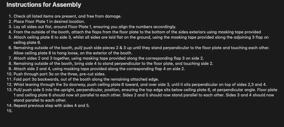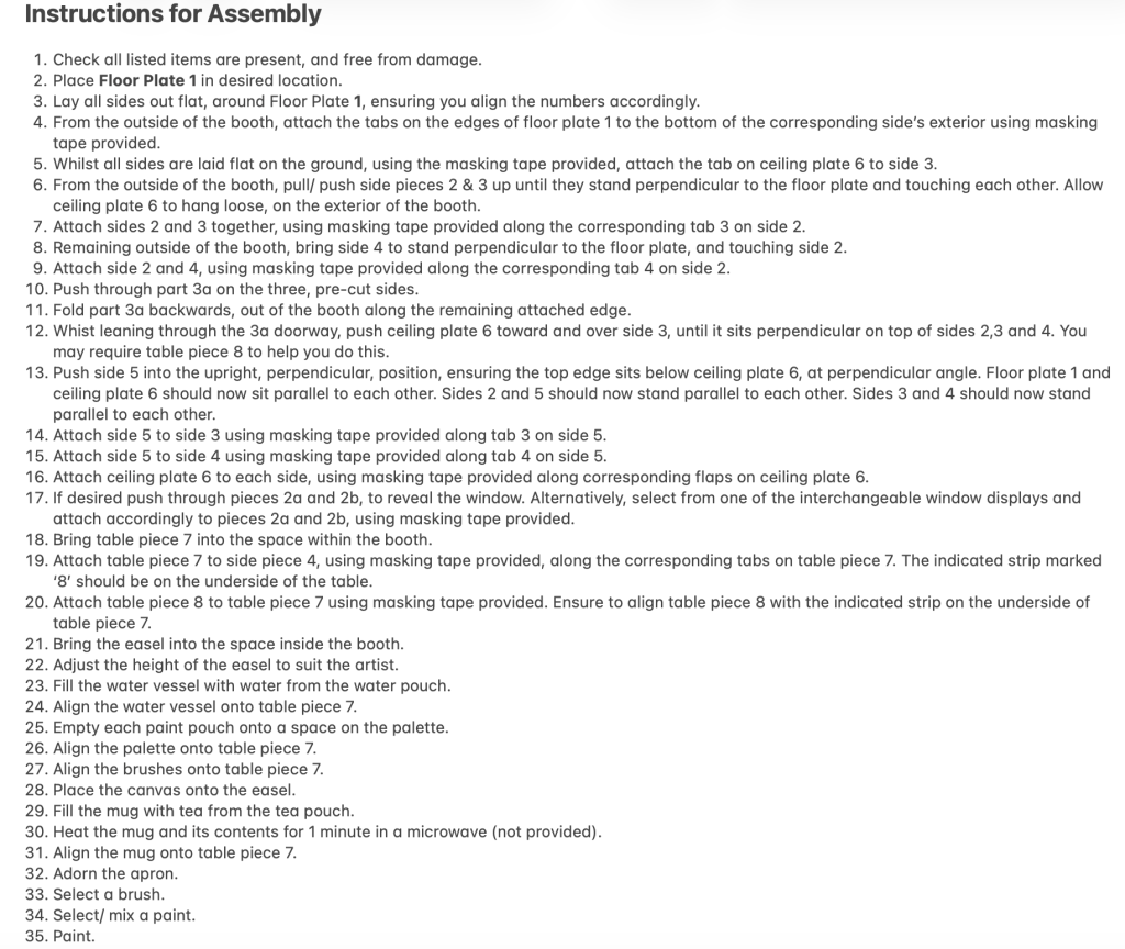 I chose to keep the step numbers included, as I feel some digits within brackets appear to break up the text nicely. I also wanted to emphasise the number of steps that I have listed for the ‘preparation’ process. Early on in the project I knew I wanted to end with the instruction to ‘paint’ – as though this is literally as far into the process as I am able to guide anyone. “The preparation stages for me are thus, the outcome is still down to you.”