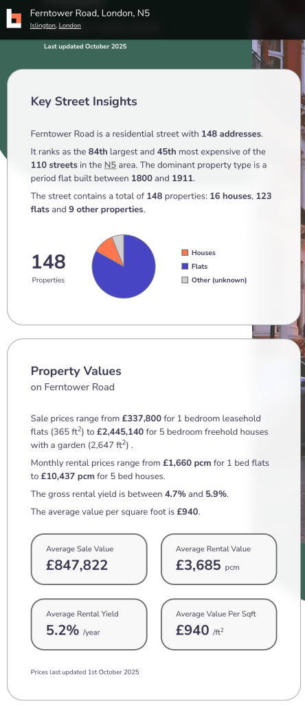 I was interested initially in how much space was available for the price. The website ‘Bricks & Logic’ was able to provide the most detailed results for this query, quoting a minimum £340,000 for a one bedroom flat (with approximate floor space of 365ft2), and £2.5m for a five bedroom house with a garden. The prices to rent would be upward of £1,600pcm for a one-bed flat, and £10,400 for a five bedroom house.