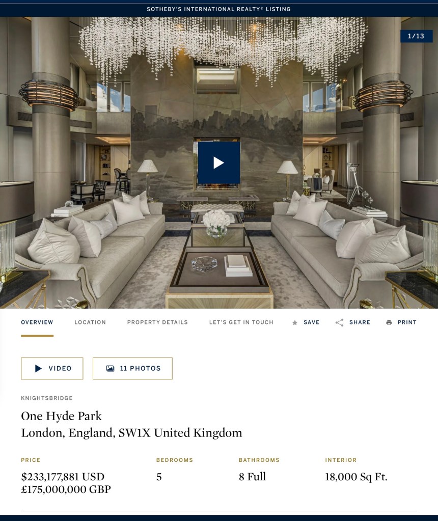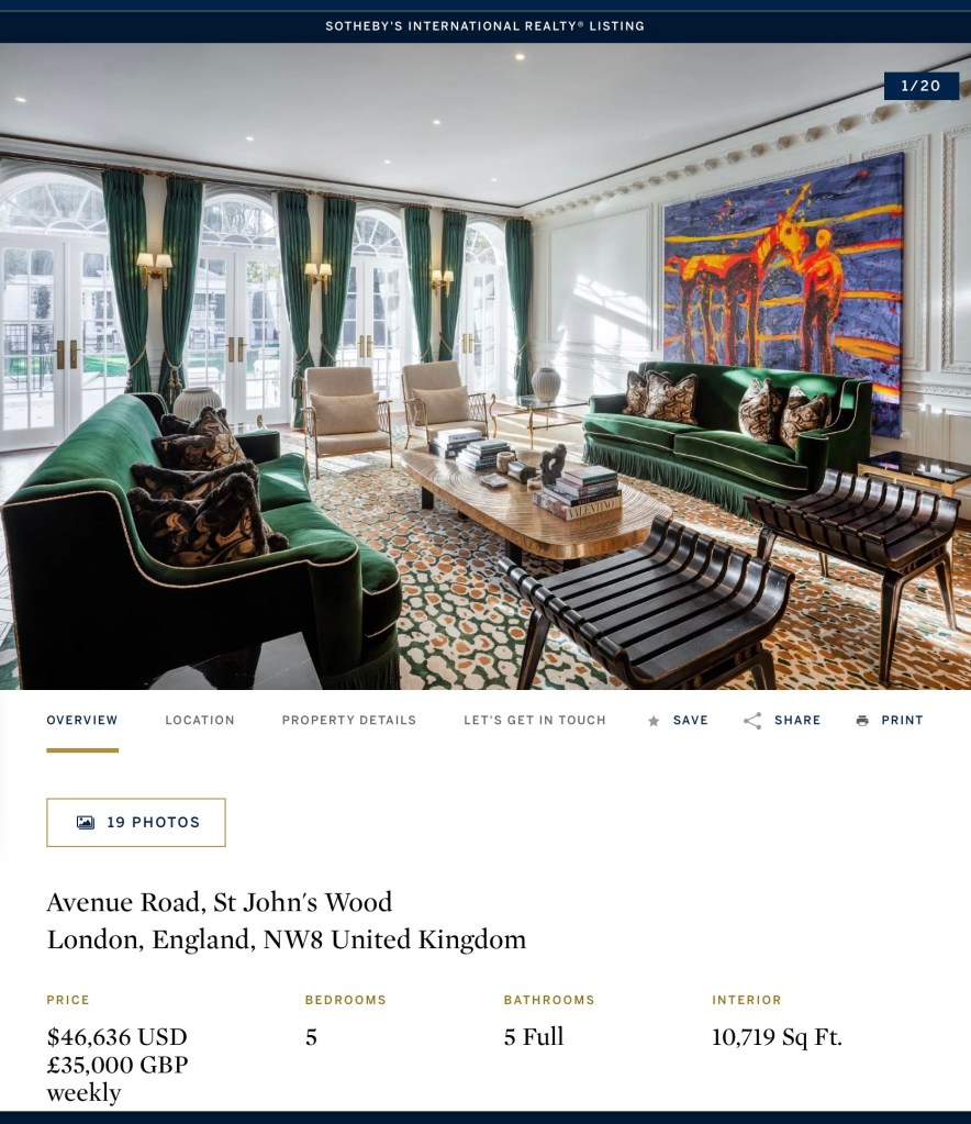 I then ran a comparison search, for the most expensive properties in London, in which the most expensive property to buy cost £175,000,000, with an interior floor space of 18,000 Sq Ft. The most expensive rental I could find on the market was £35,000 per week, with an interior floor space of 10,719 Sq Ft.