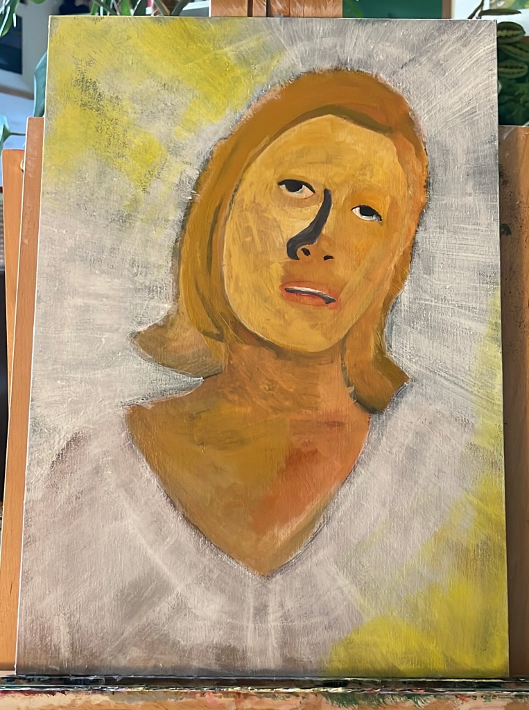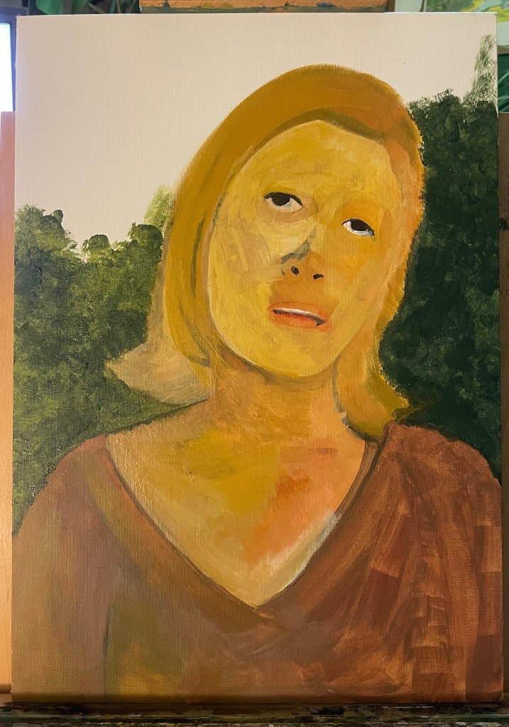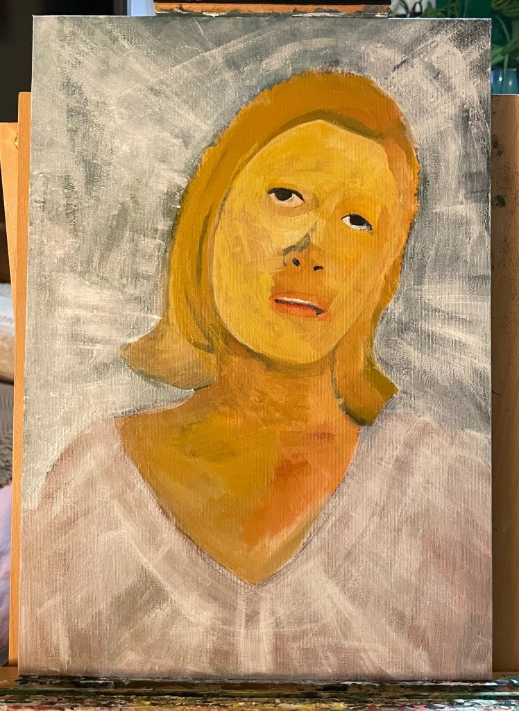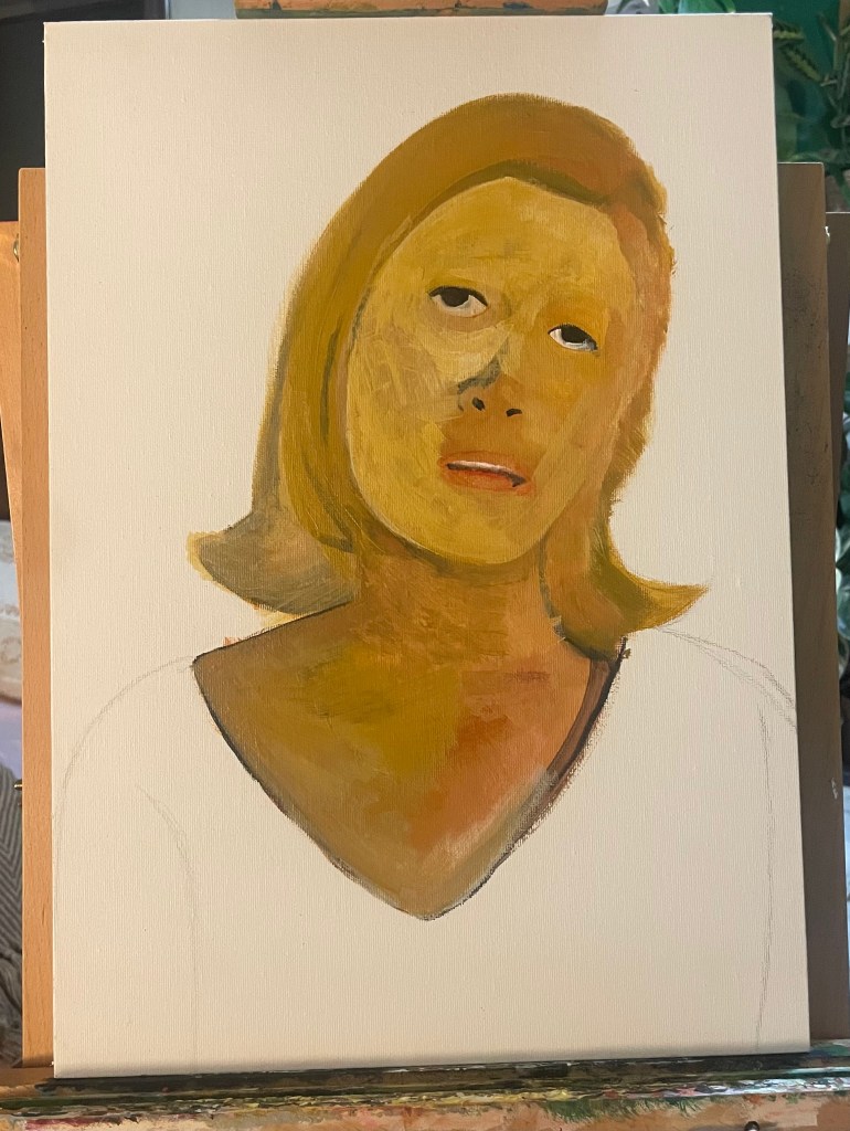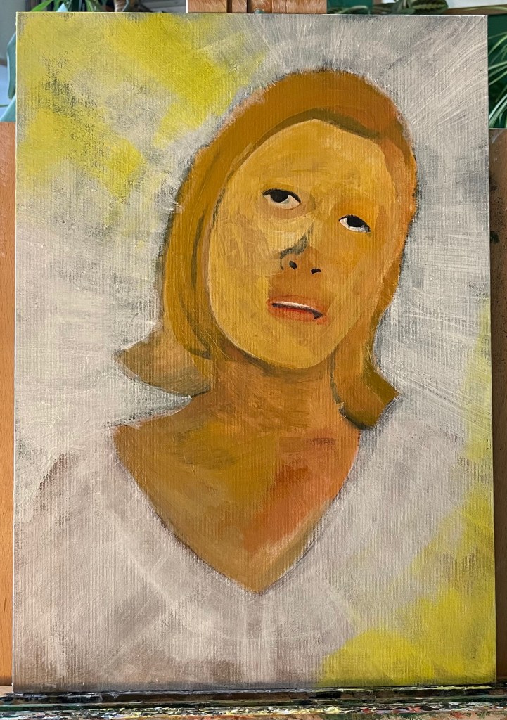 I started painting this portrait of the actress Faye Dunaway, taken from a film still from the 1967 film Bonnie & Clyde on an Insights Day at UAL Camberwell. I chose a particular still image from the film, when asked, because I had remembered liking the cinematography & grading of the film when I watched it many years ago. When I discovered we were going to paint our chosen images I felt anxious as I knew I would not be able to achieve the photo-realistic style that I usually wish to, due to the day’s time constraints and my own lack of ability to paint in this style.