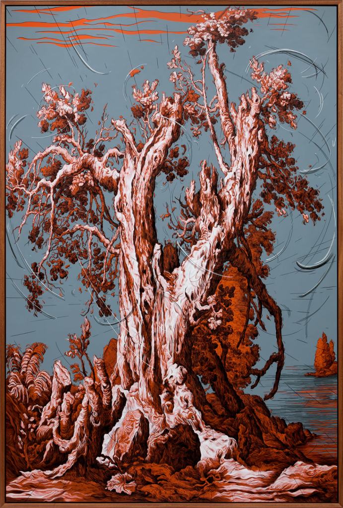 I enjoy the work of Glenn Brown, much of which is on display at The Brown Collection in London. The use of historical references feels almost elitist, as to me, images created by the artist give me a feeling of familiarity, as though the original were on the tip of my tongue, or somewhere near the front of my mental picture. For example, Brown’s piece So We Drove On Towards Death Through the Cooling Twilight, sits in a seemingly East Asian style – through my own mind. It sparks thoughts in me of cherry blossom trees and colour pallets akin to Japanese artwork I have previously seen but, again, can’t quite place the exact image in my mind as something other than I see it now through Glenn Brown’s work. I believe this was most likely intentional, as Brown describes ‘appropriations and oppositions’ as being key to his work. According to the websitehttps://gagosian.com/fairs-and-collecting/fairs/frieze-masters-2025-glenn-brown/, Glenn Brown was actually inspired to create this particular piece based on a sketch of a gnarled tree by Dutch artist Abraham Bloemaert – who himself was an influential figure within landscape art (another field I have my own experiences, and influences within).