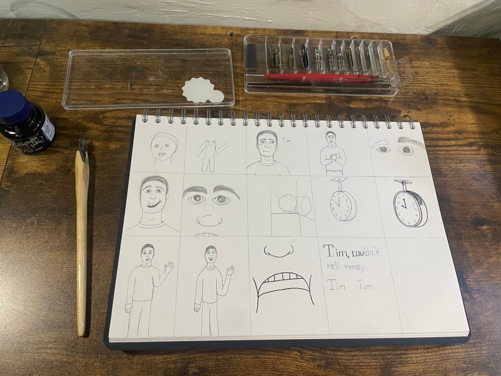 I focused mainly on Tim, as I knew that I wanted to include at least one image of the same person. As two names are mentioned in the poem, and initially I planned to include both ‘Tim’ and ‘Ben’ in my illustrations, it was necessary to ensure both characters were distinguishable from each other. One of the things I struggle with when drawing, is creating identical images – as is often needed for comic books and graphic novel drawings; so I decided quickly to scrap the idea of drawing Ben and focus on only Tim and another scene-setting illustration. I chose to focus on the clock as it was one of the images I had set in my mind. Initially the clock I pictured was decorative; the type you may see hanging in an old train station, however, when I tried to draw the four-sided clock I imagined – I realised the high level of detail may not fit with the simplistic style I was aiming for.