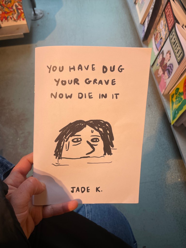 In many ways today’s trip provided positive encouragement to continue expressing myself despite personal feelings that I am not a highly skilled illustrator. I felt especially motivated by expressive artwork in a comic by artist ‘Jade K.’ Initially I was drawn to the small book because of the bold cover image in black ink, and – what I deemed to be – powerful wording. I was pleased when I saw that inside the comic the simple black and white aesthetic had been maintained.