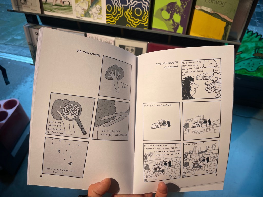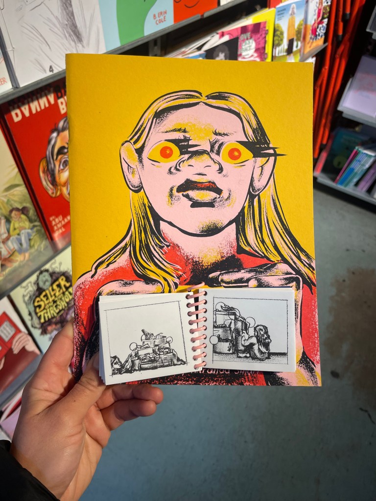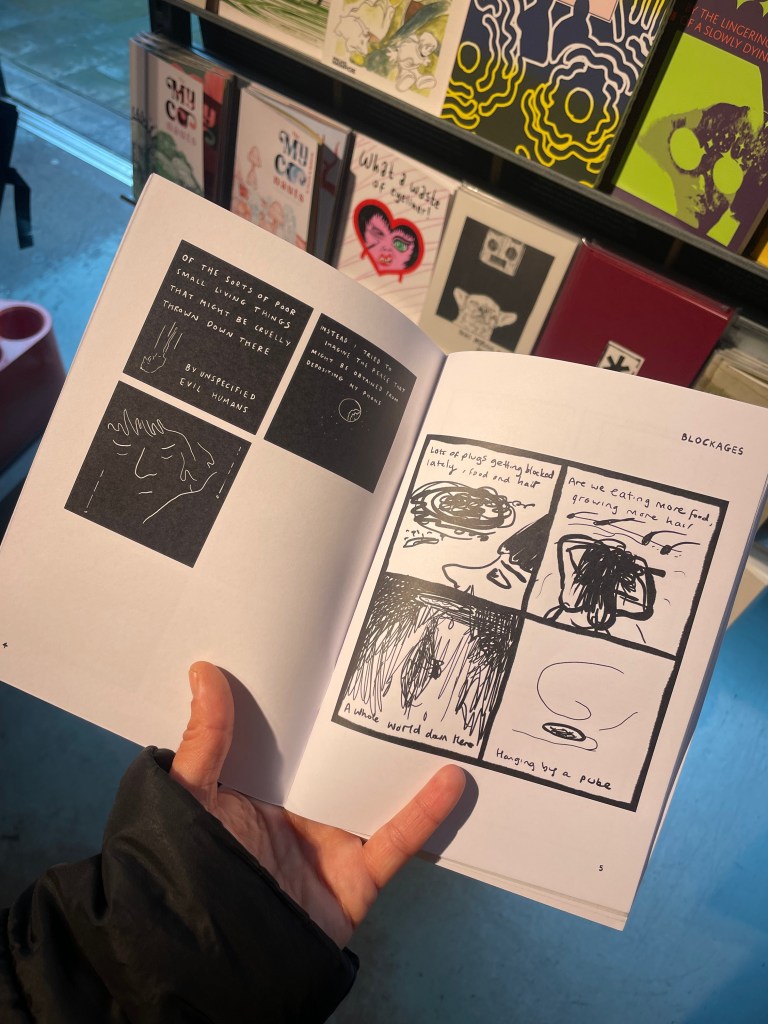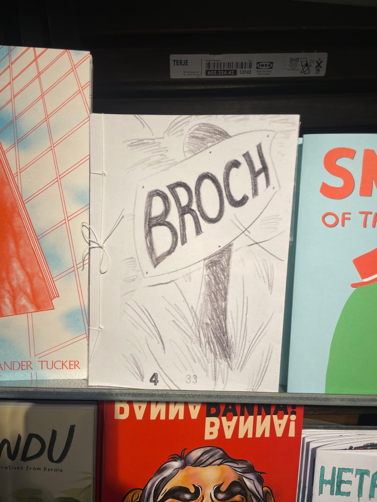 I was drawn to comics at Gosh that were interestingly bound, such as ‘BROCH’, which had visible thread holding it together. I enjoyed the hand-crafted feel to the book, and how delicate it felt to handle. This, to me, made it feel more intimate or sacred to read than a typically glued or stapled spine.